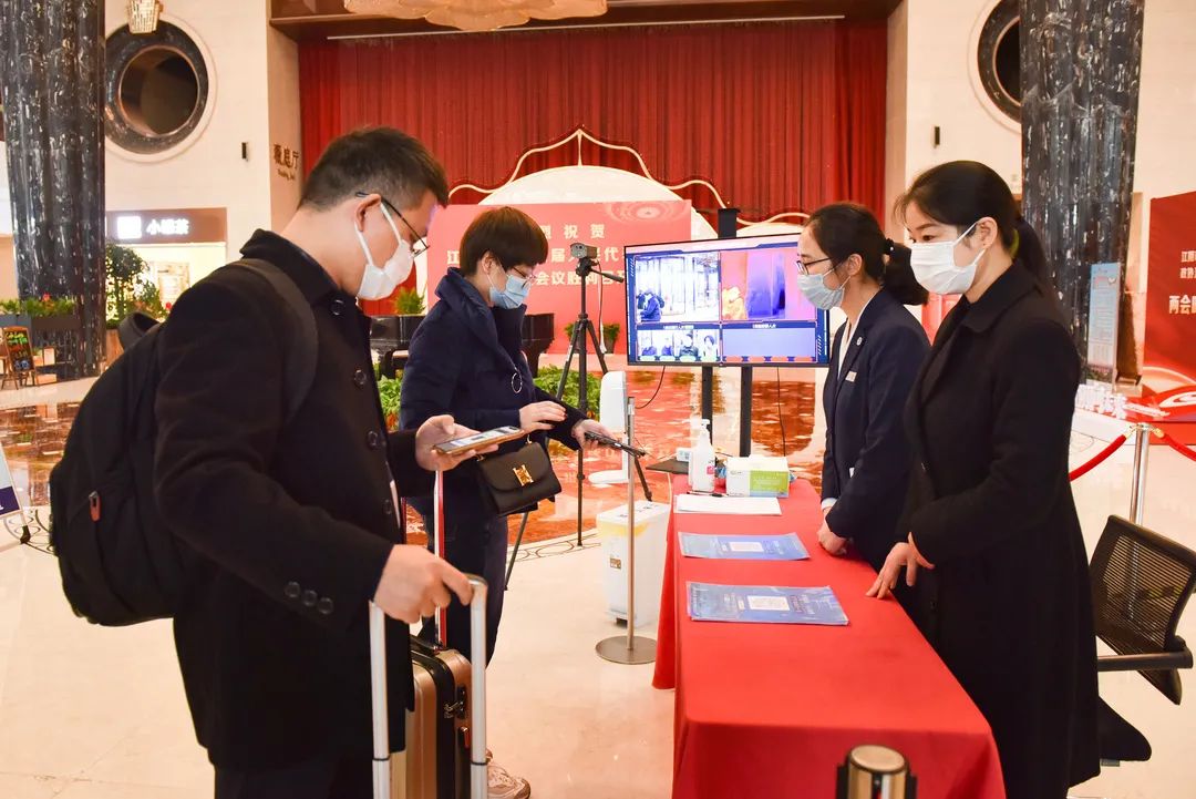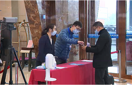 在代表驻地,疫情防控组工作人员正在给进入驻地的每一个人员进行测温和扫码。