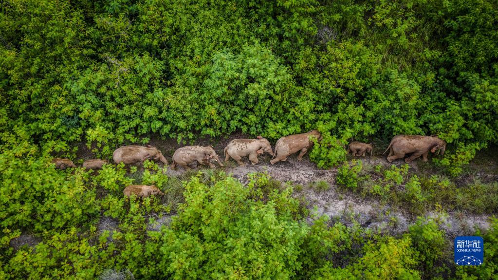 这是在云南省玉溪市元江县境内拍摄的象群(无人机照片,2021年8月9日摄)。新华社记者 胡超 摄