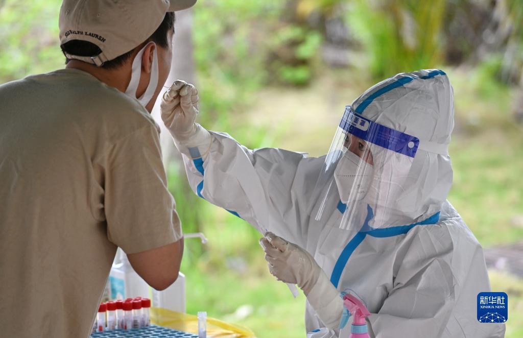 湖北省援海南三亚医疗队的医护人员余璐(右)在三亚市吉阳区东岸村为居民进行核酸采样(2022年8月11日摄)。新华社记者 郭程 摄