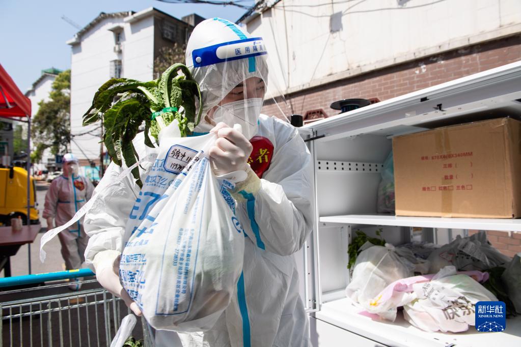 在湖南省长沙市雨花区东塘街道枫树山社区,志愿者把生活物资放进无人车,助力解决物资配送“最后一公里”问题(2022年4月7日摄)。新华社记者 陈思汗 摄