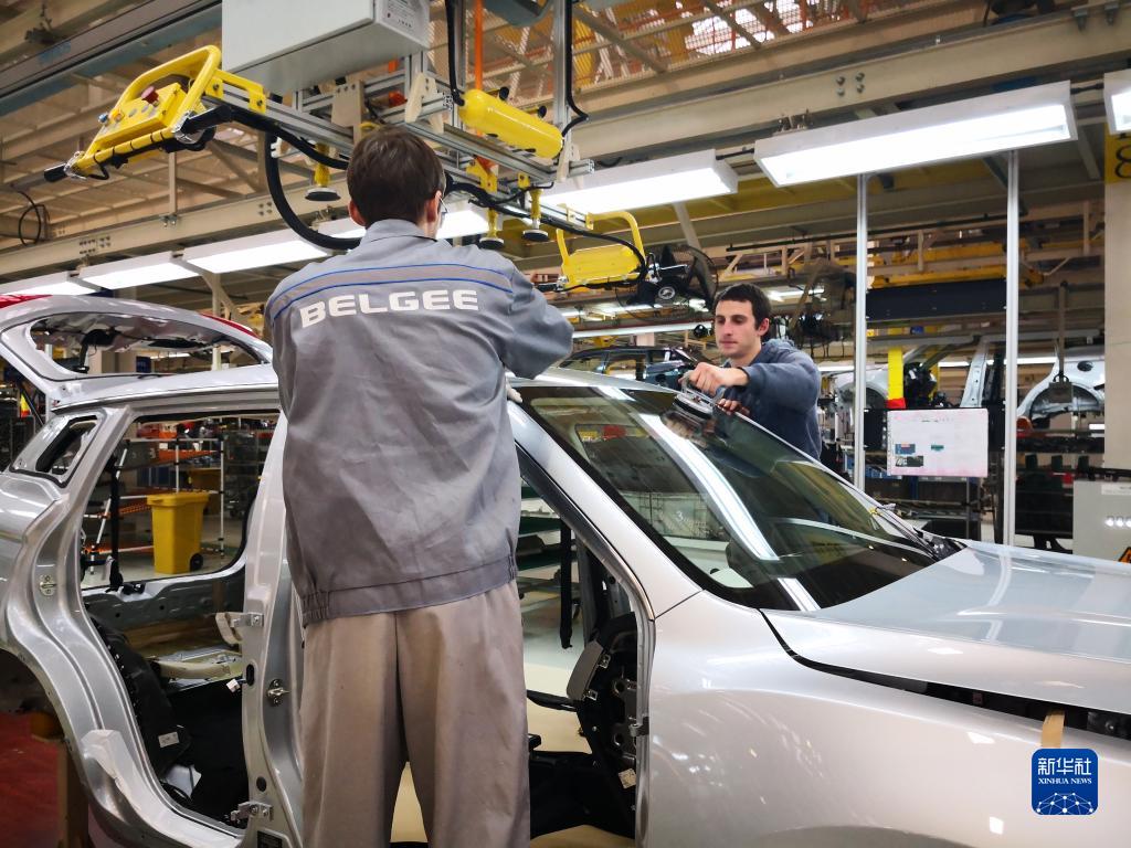 在白俄罗斯首都明斯克东北方向50公里处的白俄罗斯吉利全散件汽车制造厂总装车间,工人组装车体(2018年12月1日摄)。新华社记者 张若玄 摄