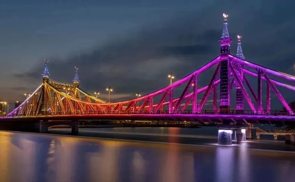 公园原先是老煤栈堆场和韭菜港汽渡码头旧址,现在拥有了江阴最炫酷的网红桥,也是韭菜港公园的地标,尤其到了晚上,桥上灯光秀,五光十色、璀璨绚烂。