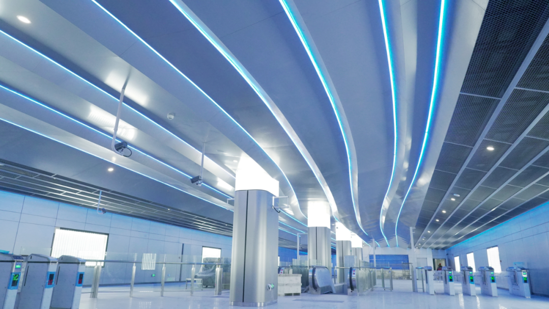江阴外滩站作为s1线起始站,位于春申路与韭菜港路交叉口处,为地下二层岛式车站。车站有效站台长度120米,是s1线体量最大的站点,相当于3个标准站的大小。车站吊顶通过模拟江潮迭起的形态,展现出律动柔美的曲线,沿天花板造型铺设的暗藏灯光不仅满足了照明的实用功能,而且营造出时尚运动的活力氛围。
