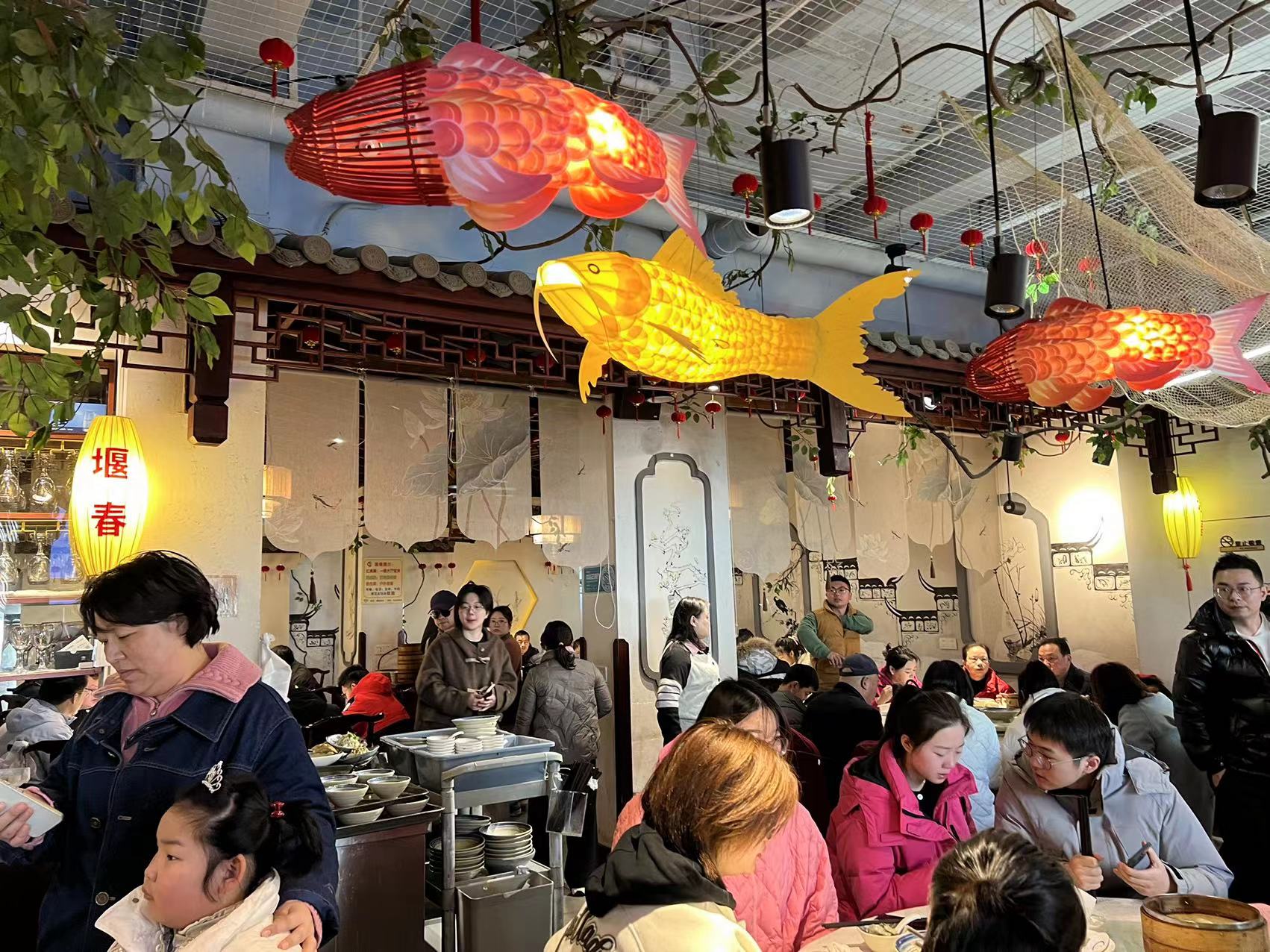 堰春饭店主打泰州特色早茶,不仅是张先生慕名而来,很多本地人和外地游客也起个大早品尝美食。“秧草包已售罄,蟹黄包、大煮干丝、烫干丝、虾仁蒸饺、鱼汤面还有,请收银台排队点餐。”9点出头,店里大厅早已坐满,大厅内的实时客流表上显示着上菜进度。另一边,门外的临时座位也满是食客,排队的队伍老长。店长表示,“春节期间生意非常好,我们的员工都起早带晚加班工作,还请了一些假期工过来帮忙。”