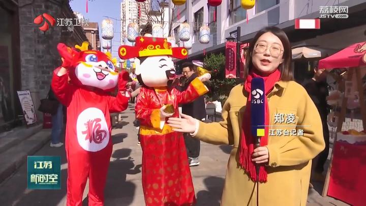 江苏台记者郑凌:“这里是南京熙南里街区。大年初五,这里安排了热闹的迎财神活动,财神爷正在为过往的游客们发放礼物。”