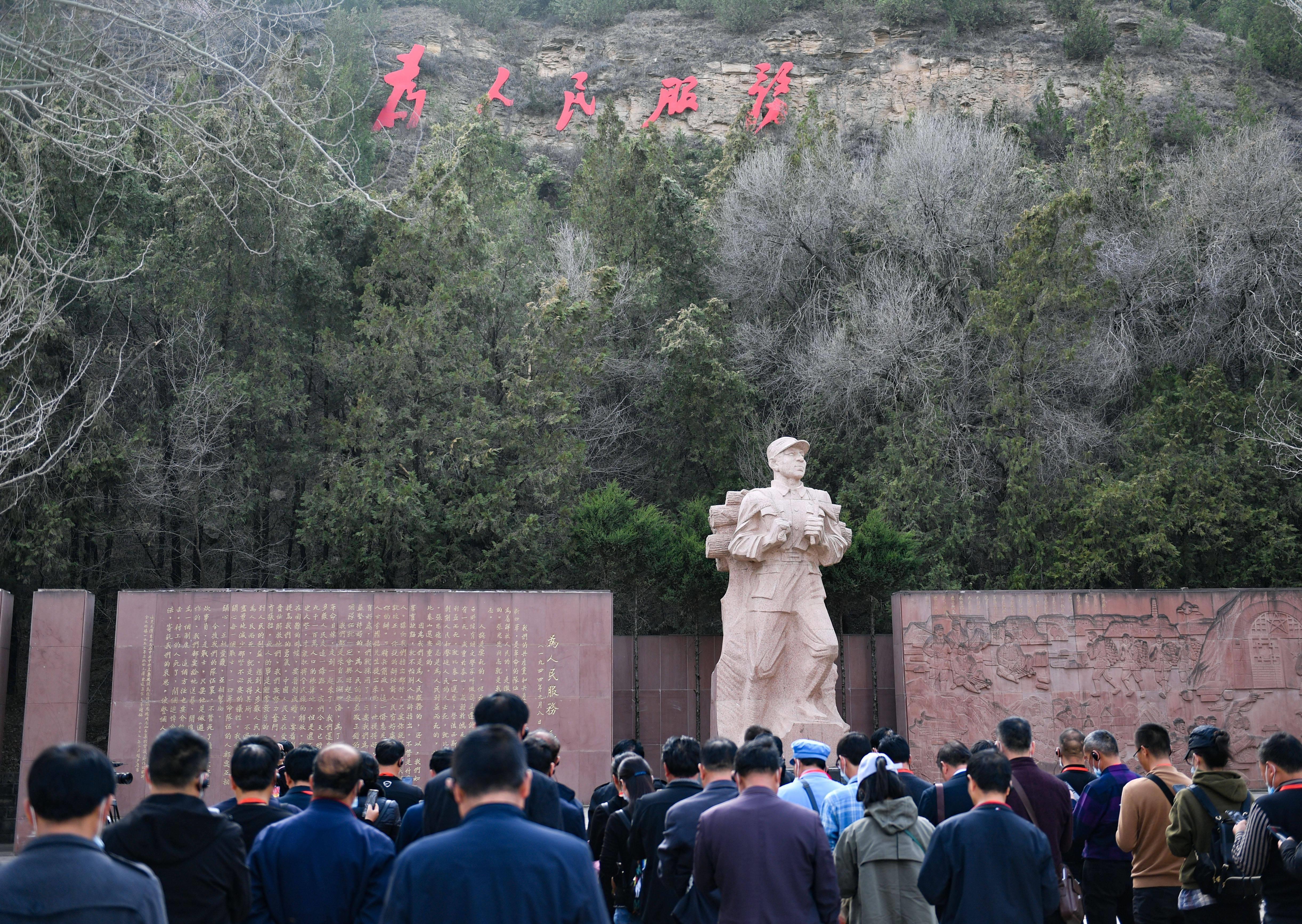 延安枣园,《为人民服务》讲话纪念广场,张思德负薪前行的雕像,巍然屹立,“为人民服务”5个鲜红大字,熠熠生辉。“具有全心全意为中国人民服务的精神”,在党的七大上被写进党章。