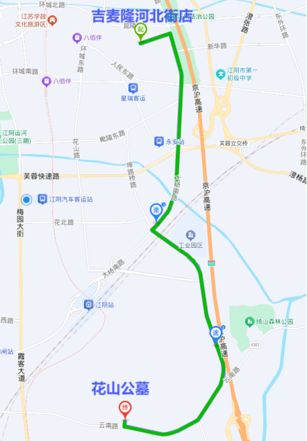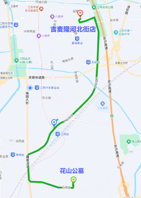 城市公交选择河北街“吉麦隆河北街店”作为始发站,沿河北街—大桥路—花东路—云南路至花山公墓内。