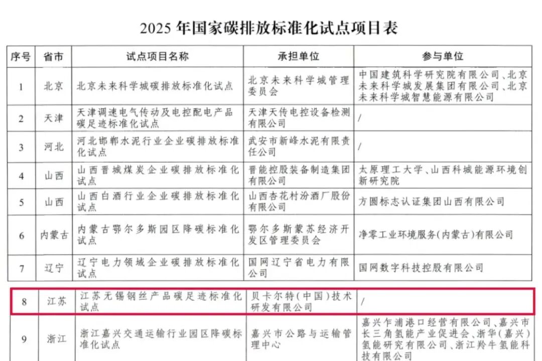 2025年12月,国家市场监管总局、国家发展改革委公布了2025年度国家碳排放标准化试点项目名单,全国共有30项碳排放领域标准化试点获批,其中,贝卡尔特(中国)技术研发有限公司“钢丝产品碳足迹标准化试点”项目成功入选,成为2025年度全省唯一国家级碳排放领域标准化试点项目。该项目将围绕钢丝产品从原材料到成品的全流程,依托企业数字化平台与全球技术经验,开展碳足迹标准研制、数据系统开发与产业链协同机制建设。