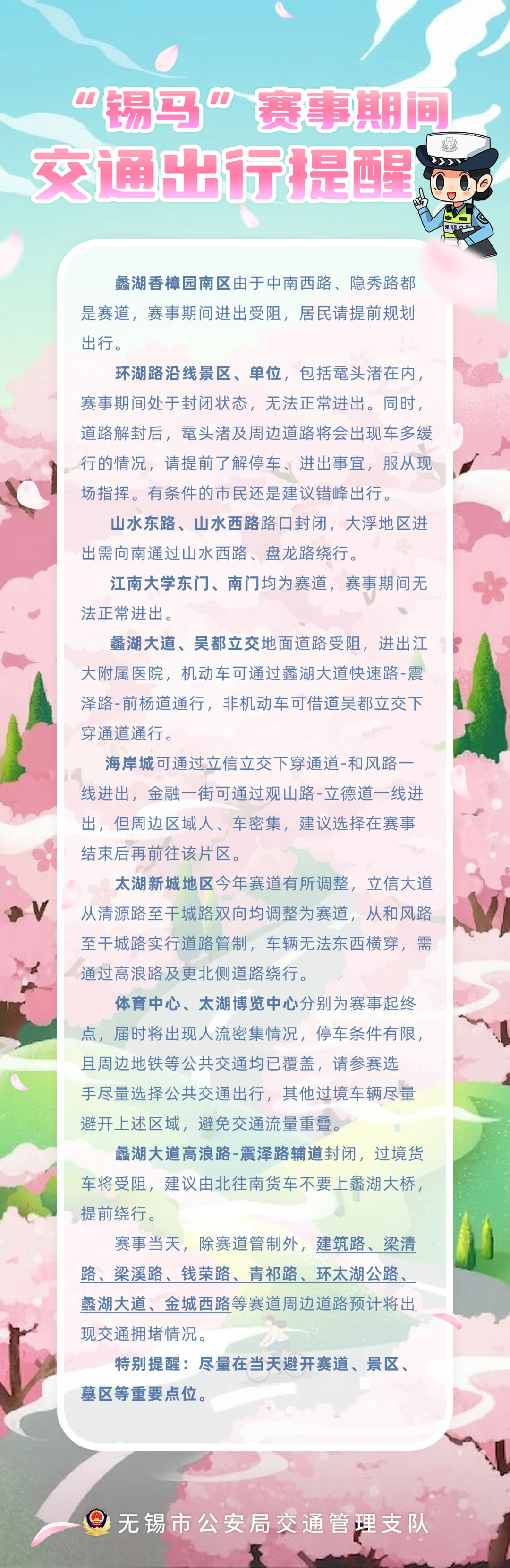 请广大市民提前关注“无锡交警”官方微博,赛事当天,我们将实时发布道路解封信息、拥堵路段提示及绕行建议,助您“避坑”不迷路 。